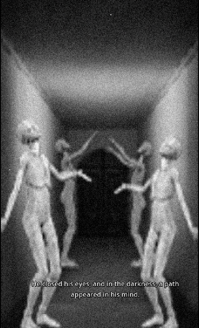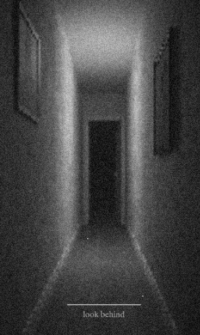 The Dollhouse is a monolithic cube shaped object with a door - it’s almost reminiscent of the Kaaba. The player is contacted by a mysterious unknown person via a walkie talkie. This third party encourages the player to enter the Dollhouse to help with the “Protocol”. What is the protocol? Too many questions, just do what you are told. The mysterious person on the walkie talkie informs the player that they will be silenced for the duration of the protocol. Get cracking! It’s time to get inside that Dollhouse! Ahh, here we are. Welcome to the grainy black-and-white hallways that compose the Dollhouse. Feel free to explore. The player can only move forward through the house and hallways, but they are given great agency and control via a “Look Behind” button that allows them to turn around and look down the hallway behind them. The voice on the talkie suggests this is to help keep your sanity and wits, but in reality, it seems like this feature does nothing. I played through twice, and the second playthrough I didn’t “look behind” a single time and nothing changed with my ending.